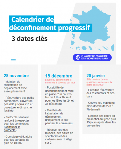 28 Novembre 2020 : première étape du déconfinement progressif Un point sur le protocole renforcé et les mesures Dès demain est mise en place la première phase du déconfinement progressif, qui permettra, entre autres, la réouverture des petits commerces. Un protocole sanitaire renforcé sera à respecter pour tous les commerces, afin d'éviter la recrudescence de l'épidémie : Renforcement de la jauge : Les commerces ne peuvent pas accueillir plus d'un client pour 8 m2 de surface ; Renforcement de l'information du client par un affichage plus complet ; Renforcement des mesures pour garantir l'effectivité des principes de distanciation et d'hygiène. Retrouvez le détail de ces mesures dans le document ci-joint.
